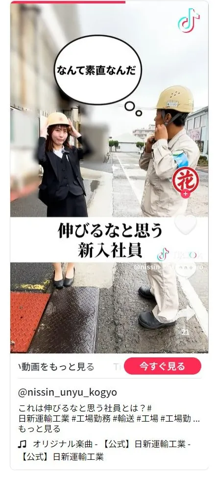 まずは、運輸業を営む日新運輸工業株式会社。同社は、現場の雰囲気や働く社員の姿を中心にしたリアルな動画を投稿し、運用開始1ヶ月で150万再生を達成。従来の採用活動ではリーチできなかった層にも訴求でき、採用ページのアクセス数が急増。結果として、採用母集団の拡大や職場見学希望者の増加につながった。採用難が続く物流業界において、TikTokは有効なブランディング手段として定着しつつあることを示す好例だ。