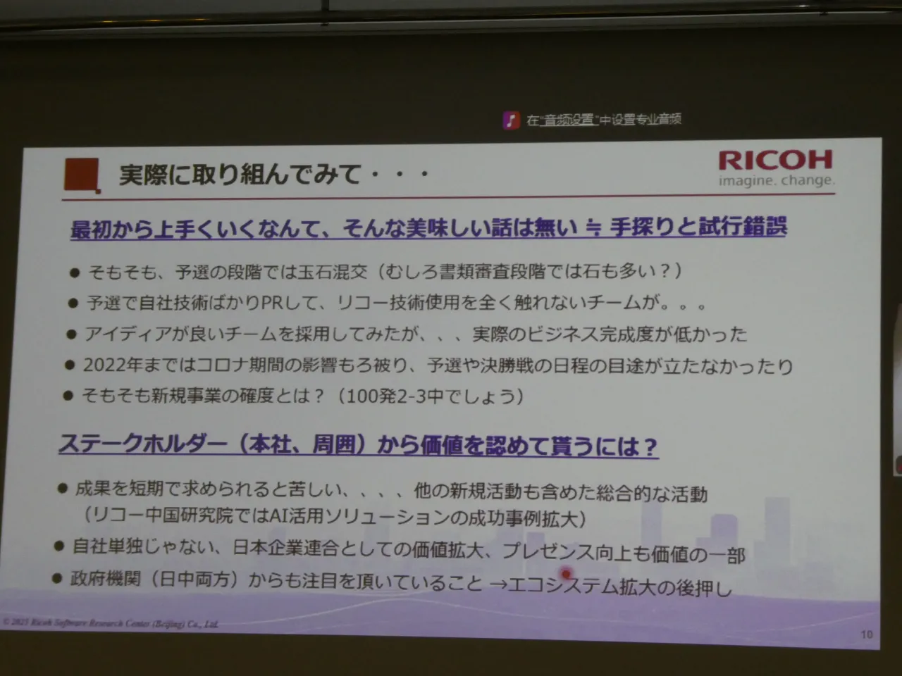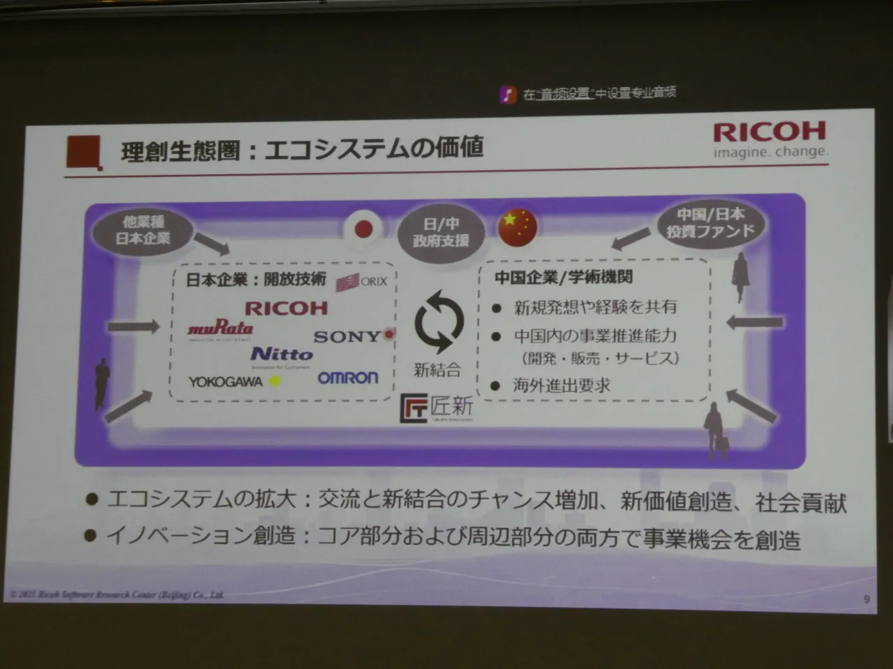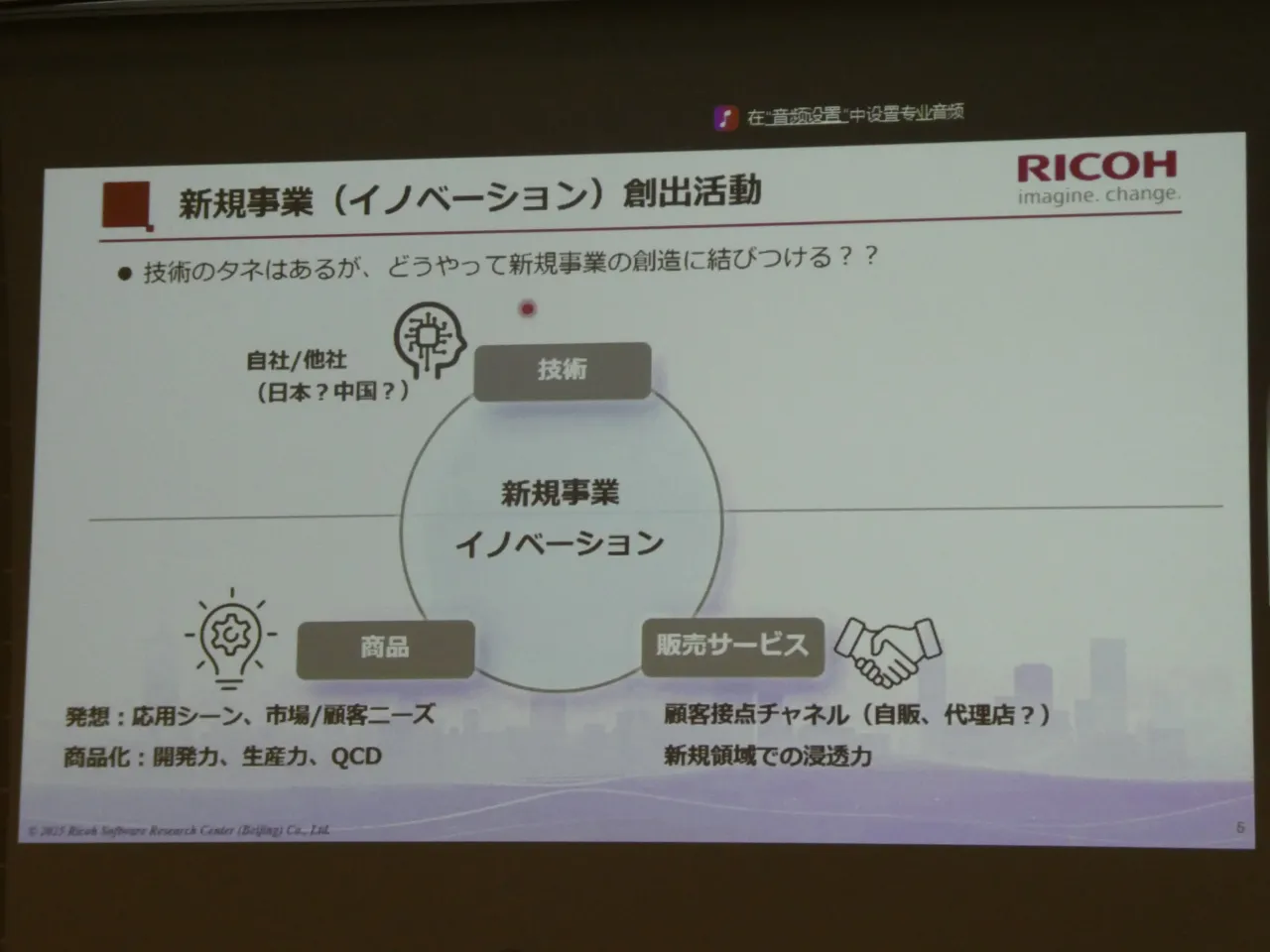 2025年12月4日、東京で開催された「2025 日中イノベーション・デイ」。藤本豪さんは中国・北京からオンラインで登壇し、リコーにおける中国戦略と共創の取り組みについて語った。藤本さんは現在、リコーデジタルサービス(RDS)BU 中国総合戦略部 部長を務めると同時に、北京にあるAI研究拠点「Ricoh Software Research Center (Beijing) Co., Ltd.(SRCB)」の社長を兼務している。