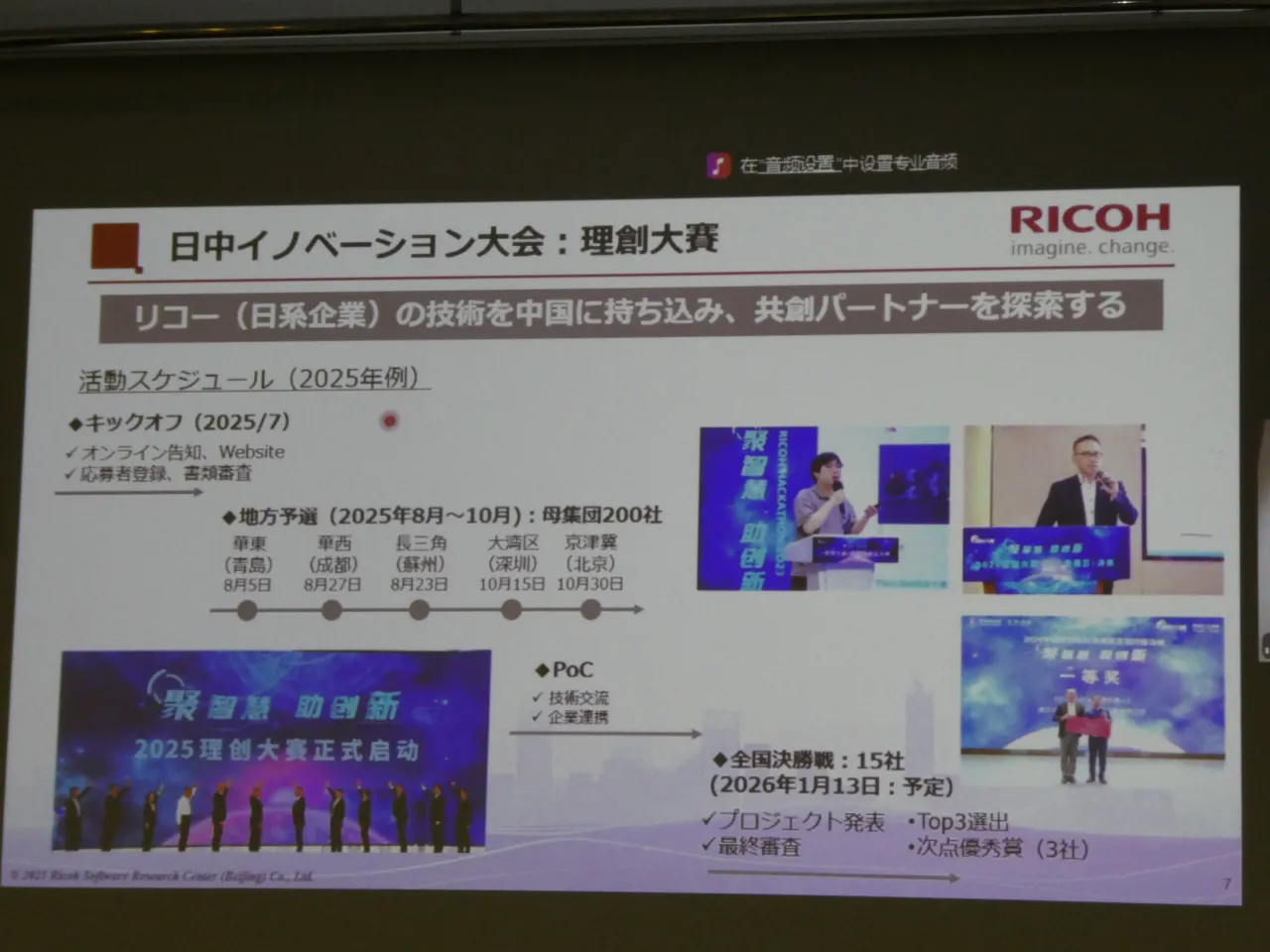 2025年度はウェブサイトやパートナーを通じて公募を行い、青島、成都、蘇州、深圳、北京など5都市で予選を実施。約200社が応募し、そこから選抜された15社が全国決勝へ進む。「2026年1月には北京で決勝戦を予定しています。中国の官製メディアにも取り上げていただき、大きな注目を集めています」(藤本さん)