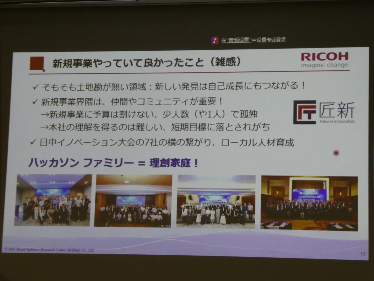 2025年12月4日、日中間のスタートアップ支援とオープンイノベーション支援を手掛ける匠新(ジャンシン)主催の「2025 日中イノベーション・デイ」で、リコー RDS 中国総合戦略部 部長 兼 Ricoh Software Research Center (Beijing) Co., Ltd. 社長の藤本豪さんが登壇した。テーマは「日中企業連携のイノベーションプラットフォームの取り組み」。かつては「オフショア研究開発拠点」と見られてきた中国拠点はいま、最先端技術と事業創出を担う前線へと変貌しつつある。藤本さんは、自身が中国で推進してきた共創の実践をもとに、単独主義を超えた日中企業連携のリアルと、その先に広がる可能性を語った。(文=JapanStep編集部)