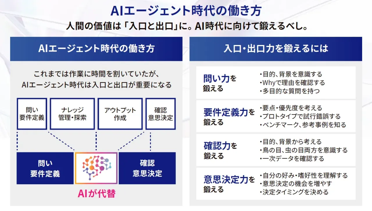 「これからの時代、AIに代替されない仕事とは何か—— それは、『入口』と『出口』にあるんです」。馬渕氏は、AIがナレッジワークの中核を担い始めた現代において、人間が価値を発揮すべき領域をそう表現する。つまり、「入口」とは問いの設計、要件定義、仮説立案といった思考の起点であり、「出口」とは意思決定、結果の評価、最終責任の担保といった社会的判断のことだ。