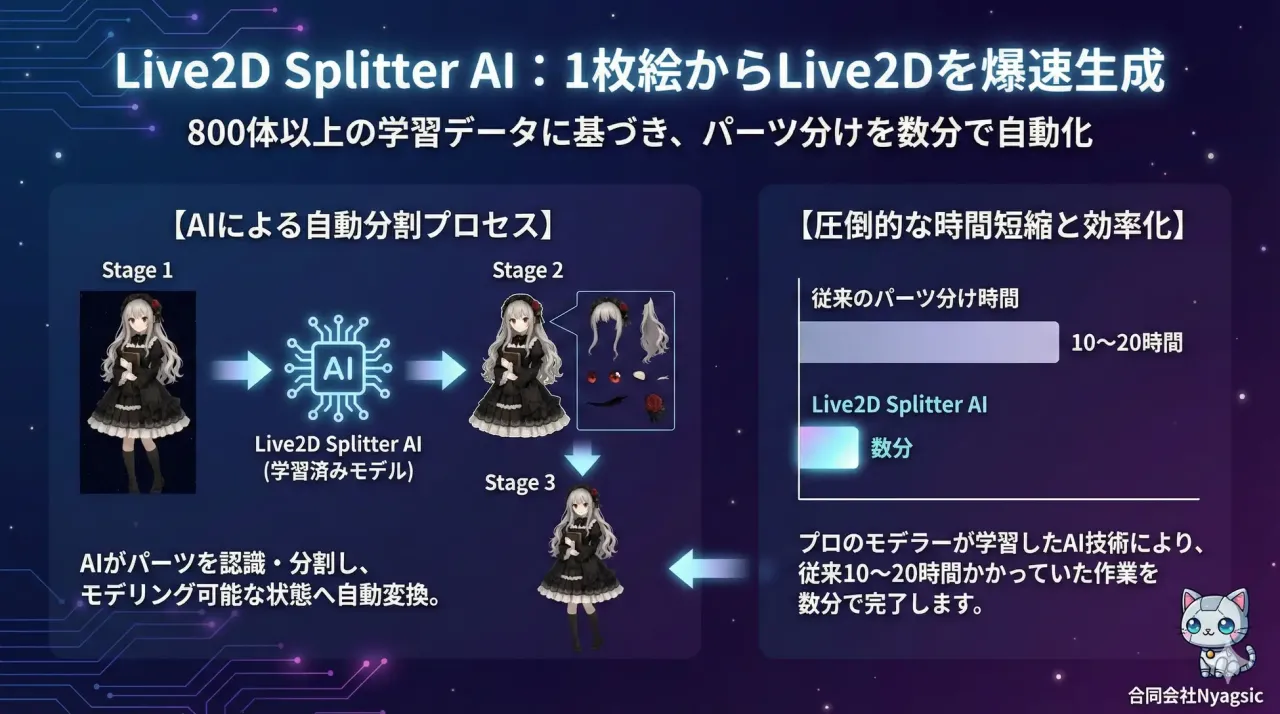 実務面においても、24時間365日の無人運用を想定した自動復旧システムや、マルチLLM対応など、企業が導入しやすい堅牢性を備えている。さらに、独自AI技術「Live2D Splitter AI」によるキャラクターモデルの無償制作(※1)や、配信用PCのレンタルサービス(※2)も展開。高度な技術をブラックボックス化せず、キャラクター制作から配信環境までをワンストップで提供することで、AIキャラクターという新たな市場の裾野を広げようとしている。