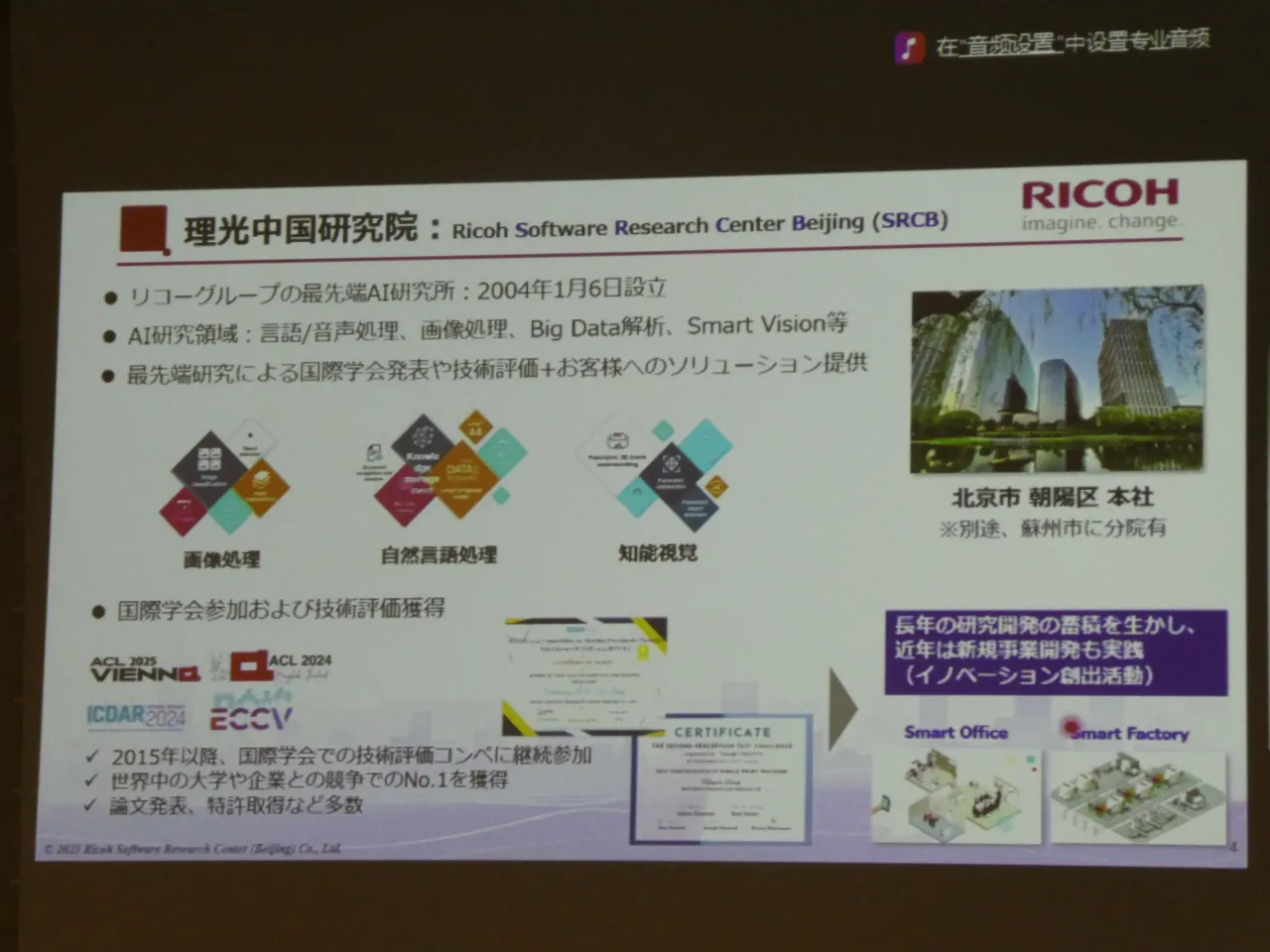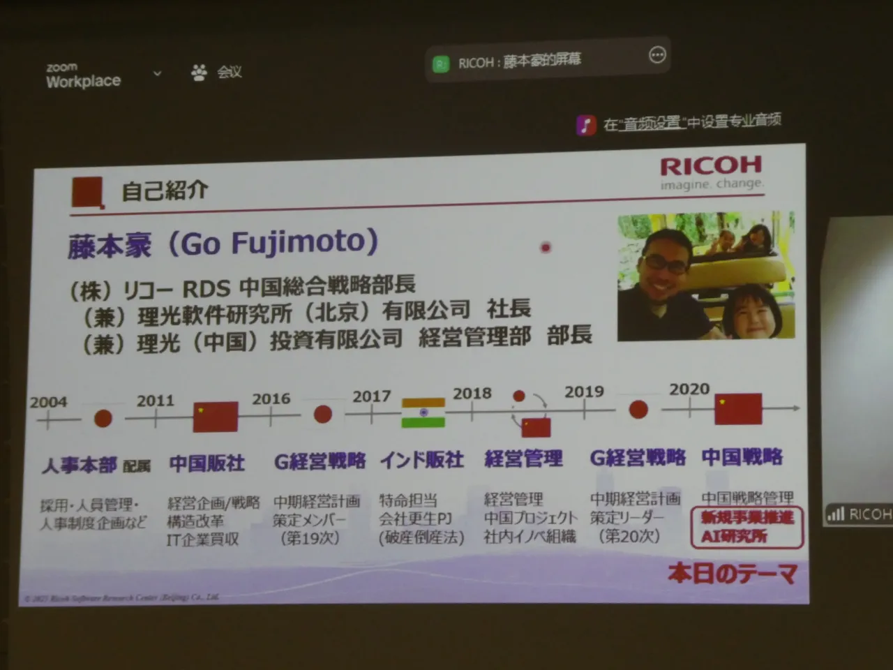 2025年12月4日、東京で開催された「2025 日中イノベーション・デイ」。藤本豪さんは中国・北京からオンラインで登壇し、リコーにおける中国戦略と共創の取り組みについて語った。藤本さんは現在、リコーデジタルサービス(RDS)BU 中国総合戦略部 部長を務めると同時に、北京にあるAI研究拠点「Ricoh Software Research Center (Beijing) Co., Ltd.(SRCB)」の社長を兼務している。