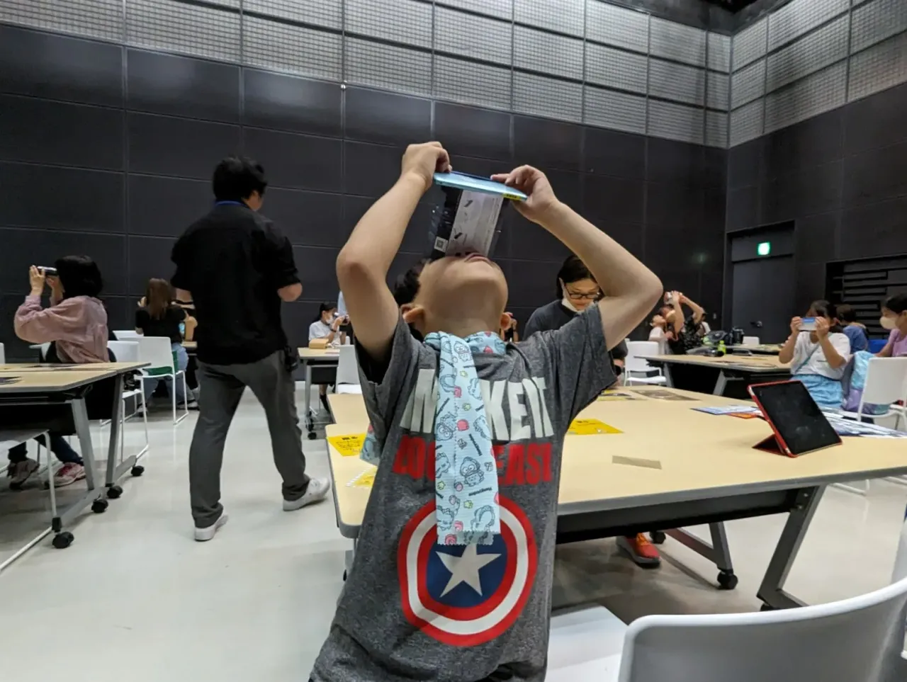 このVR体験は、日本科学未来館の企画展「NEO 月でくらす展」にも出展された。しかし、オープン当初はVR ゴーグルのメーカーによる13歳以上という年齢制限が設けられており、多くの子どもたちが体験できないという課題に直面した。来場した子どもが「やりたい」と涙を見せる様子を目の当たりにした横山氏は、年齢に関係なく体験できる手段を模索することとなった。そこで考案されたのが、安価な紙製VRゴーグルにスマートフォンを装着する「簡易VR 体験」だ。