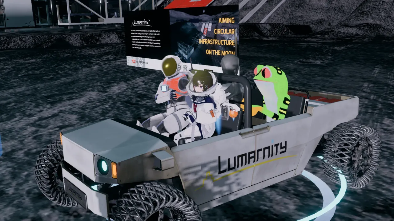同社は月面の氷から水やロケット推進剤を生成し、月面社会を支える「LunarSmart Community®」──通称「Lumarnity®(ルマニティ)」構想を描く。今回のVR教育体験は、そのLumarnity®を3DCGで可視化し、VRChat上に仮想空間として構築したものだ。