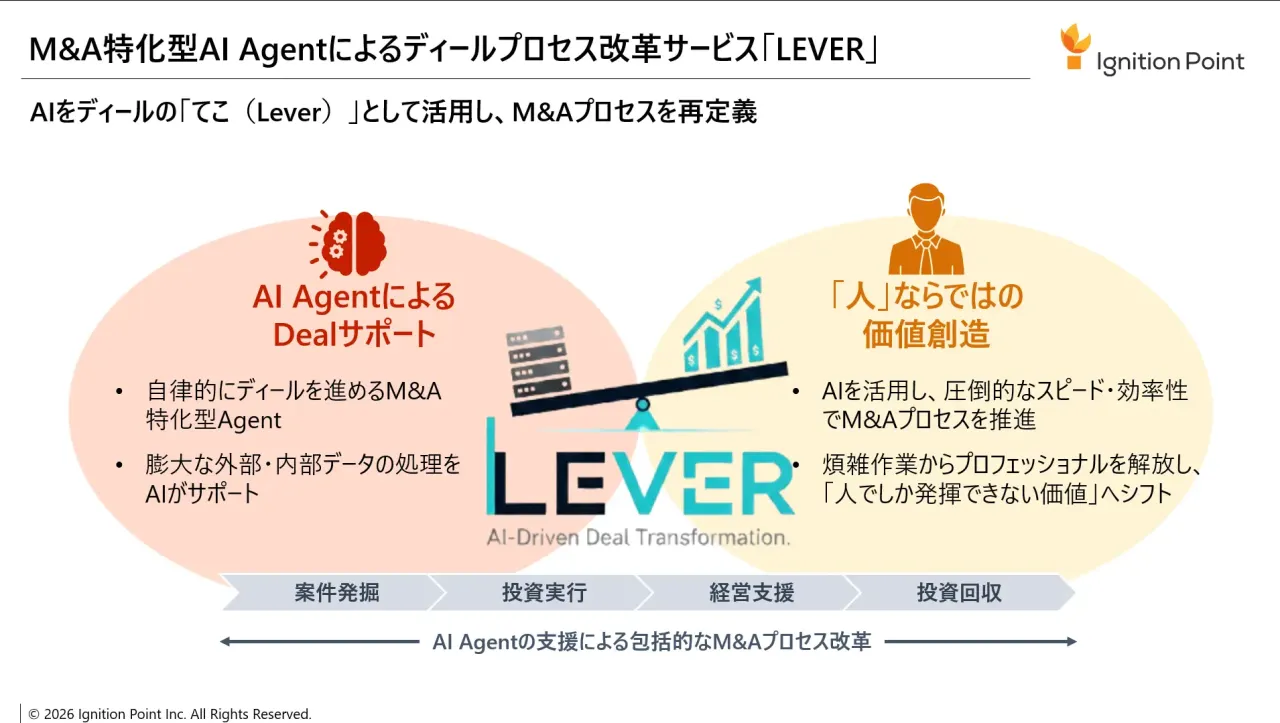 この重厚長大なディールの世界に、停滞を打破する「知能のてこ」が導入された。イノベーションファームのイグニション・ポイント株式会社が提供を開始した「LEVER(レバー)」は、M&A特化型のAIエージェントを実務の心臓部へと送り込む。かつて数週間を要した初期分析を、わずか数時間へと圧縮する圧倒的なスピード。この革新は、硬直した日本の産業構造をどのように再起動させていくのだろうか。(文=JapanStep編集部)