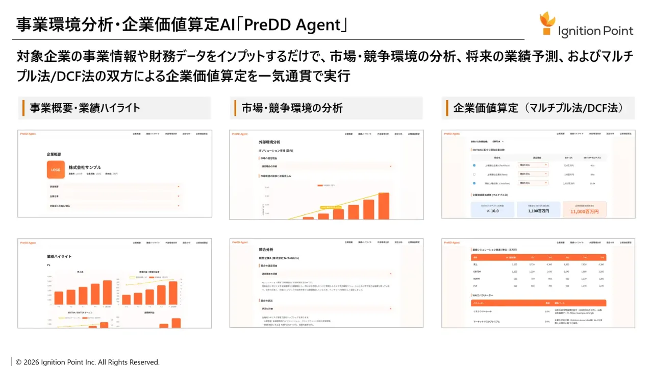 このAIエージェントの核心は、事業環境の分析と企業価値算定の完全自動化にある。対象企業の事業情報や財務データをインプットするだけで、複雑な市場・競争環境の分析を行い、将来の業績予測を弾き出す。さらに、ファイナンスの専門知識を要するマルチプル法やDCF法(ディスカウントキャッシュフロー法)による企業価値算定までも一気通貫で実行する。
